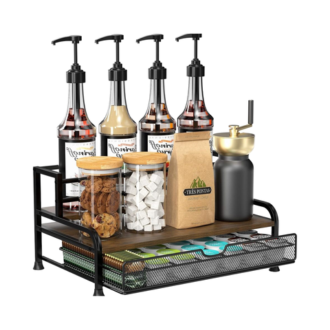 PONEYA Organisateur de support de sirop de café moderne en fer Panier de rangement à 3 niveaux et 8 bouteilles avec support de support de tasse pour comptoir de bar à café
