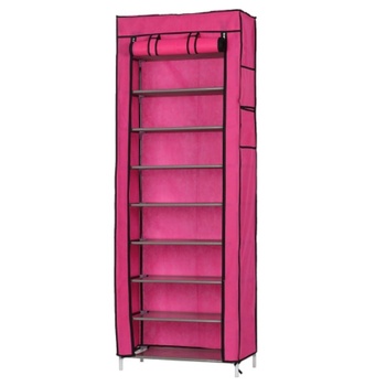 ชั้นวางรองเท้าเหล็กสีชมพู9ชั้นพร้อมผ้านอนวูฟเวนที่เก็บของแบบพกพาพลาสติกกันฝุ่นสำหรับห้องนอนทางเข้าห้องนั่งเล่น